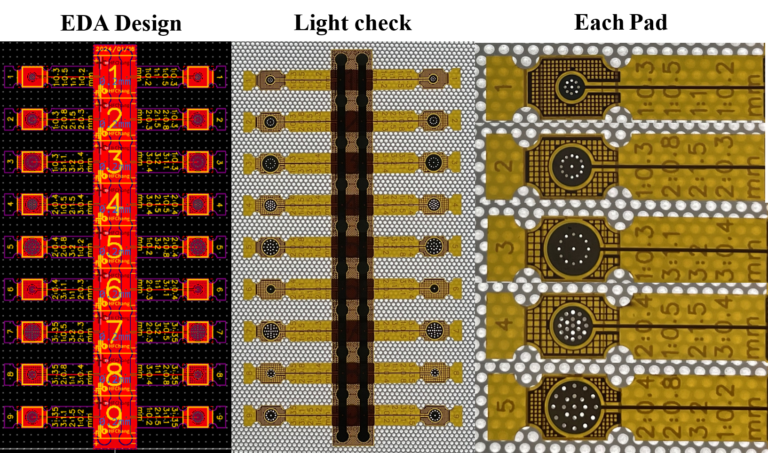 I took those 9 electrode layouts designed using the Taguchi method and arranged them all on a single FPC board. The advantage of doing it this way is: I can fabricate all the samples in one go, then cut them apart and test them individually. This requires careful planning in the EDA software to arrange them properly – making sure each design can be independently cut out, while also ensuring the electrode traces don’t interfere with each other.