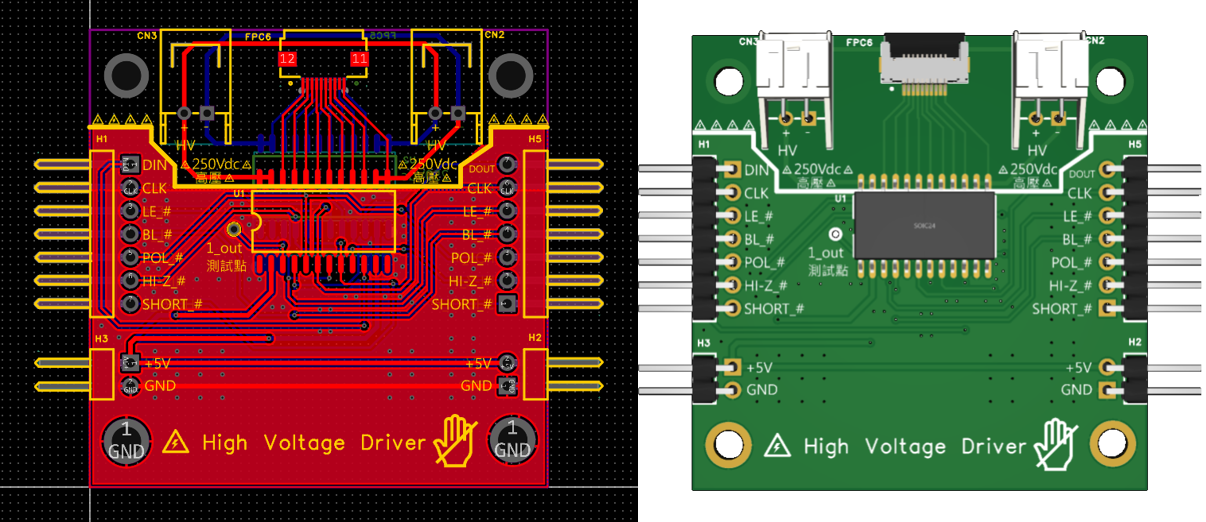 我在EasyEDA裡設計了HV513高壓控制模組的PCB。HV513是一顆8通道的高壓開關晶片,可以用低電壓邏輯信號(5V)來控制高電壓輸出(250V)。