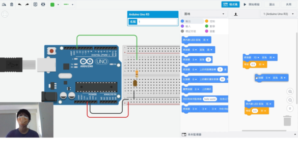 在疫情期間,利用這個系列課程中,教導了學生使用ThinkerCad 模擬Arduino的程式,實現了學生無法觸摸實體也可以學習的初衷